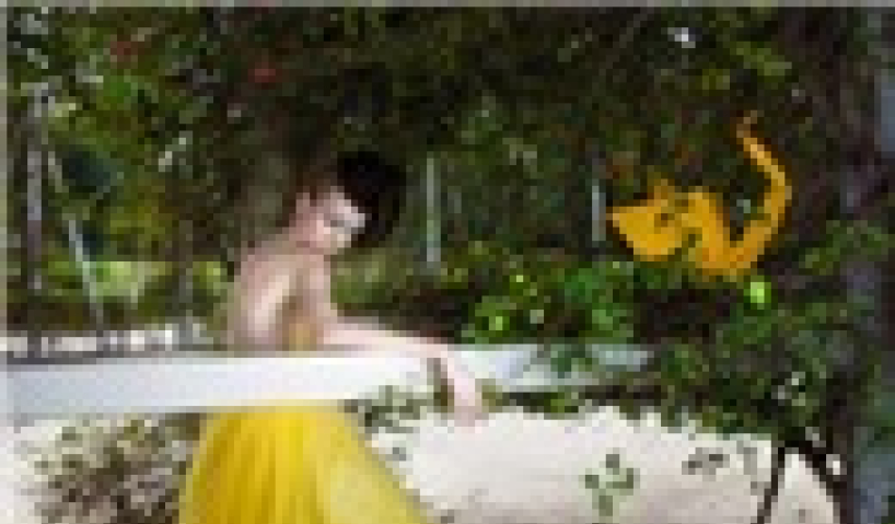 Người mẫu trẻ Courtney Jayne - một lần nữa lại hóa thành nàng tiên xinh đẹp mặc chiếc váy vàng như vạt nắng - thơ thẩn trong khu vườn bí mật. Dưới ống k